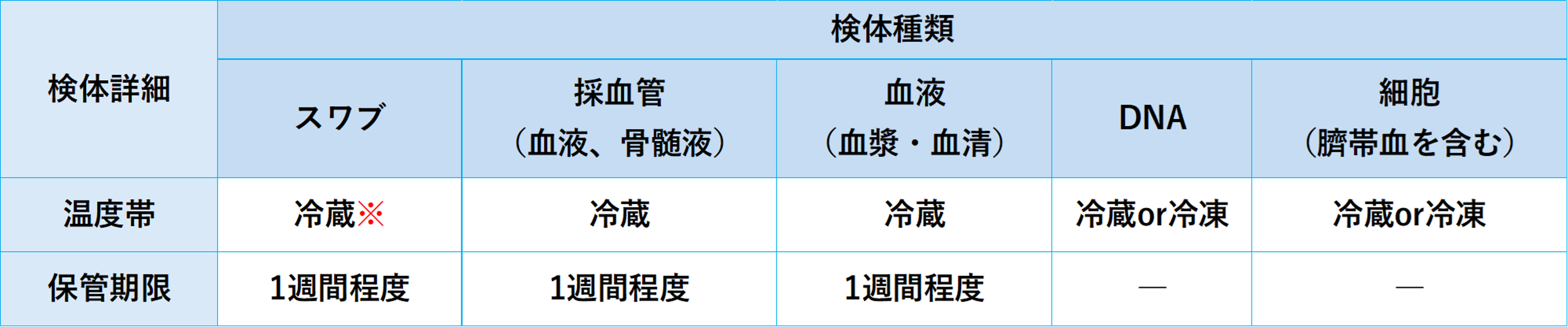 検査依頼書と検体を必ず同封して、下記の表にしたがいお送りください。