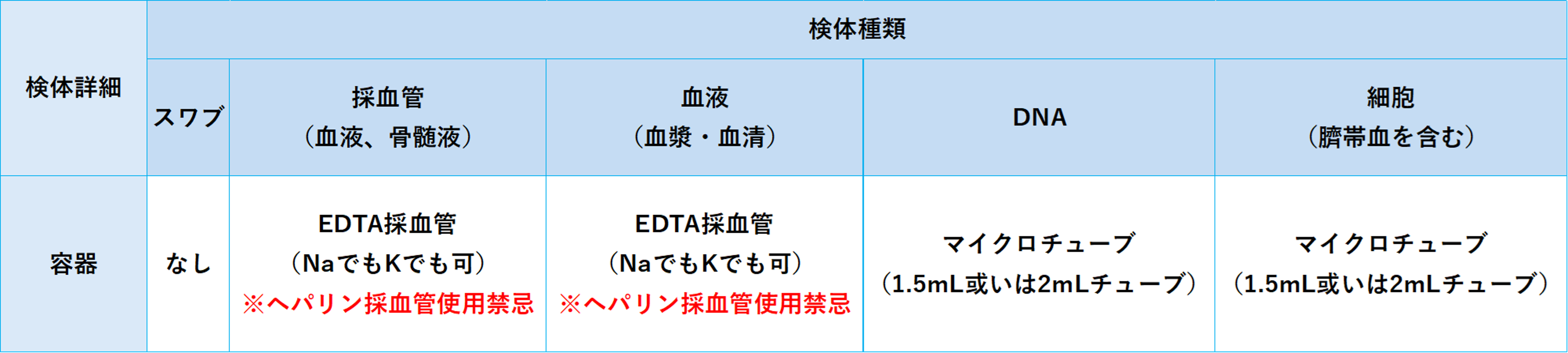 (※有核細胞数は「1×105」あれば検査可能です。) - 上記以外の検体で送付したい場合は、ご相談ください。